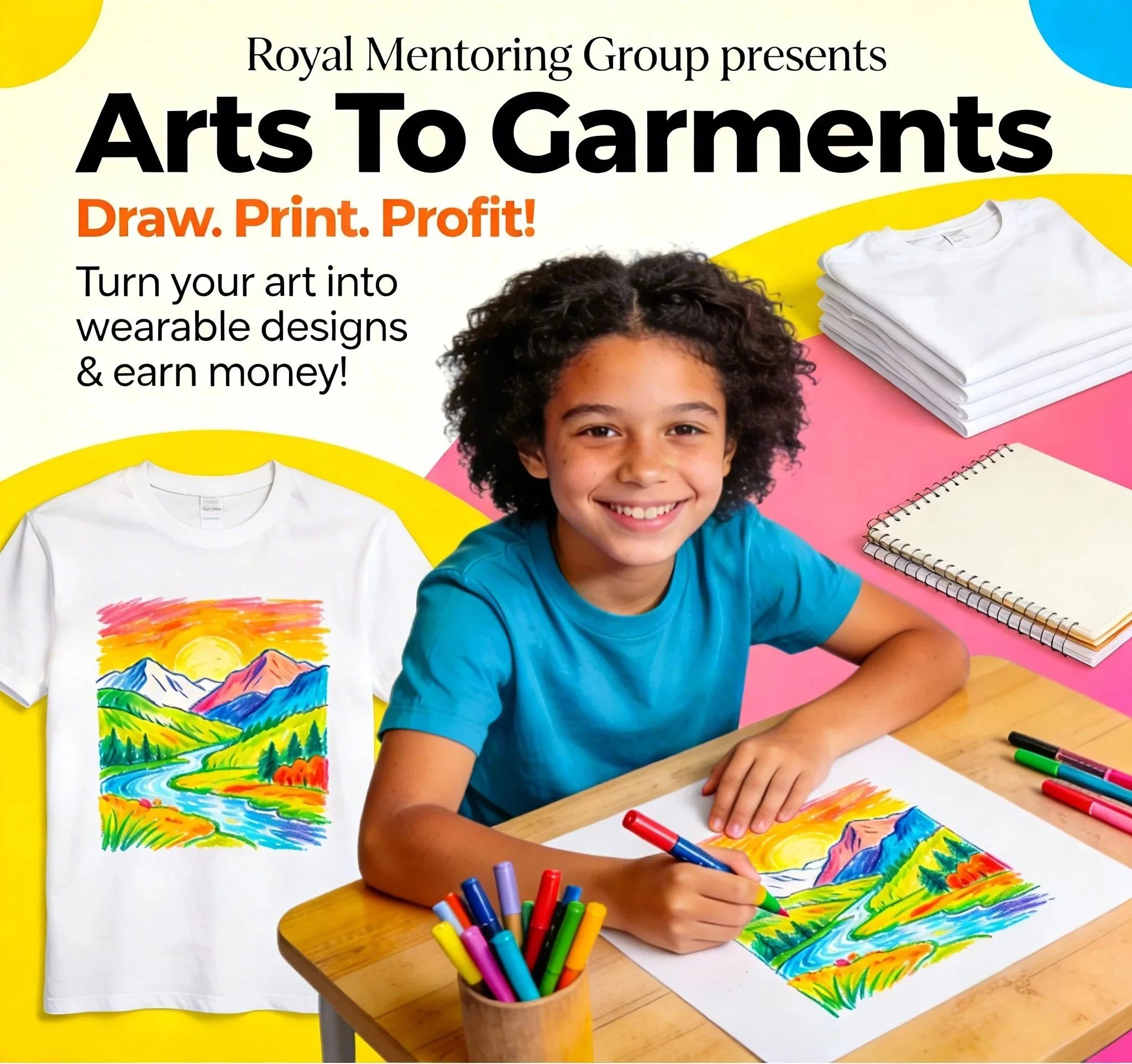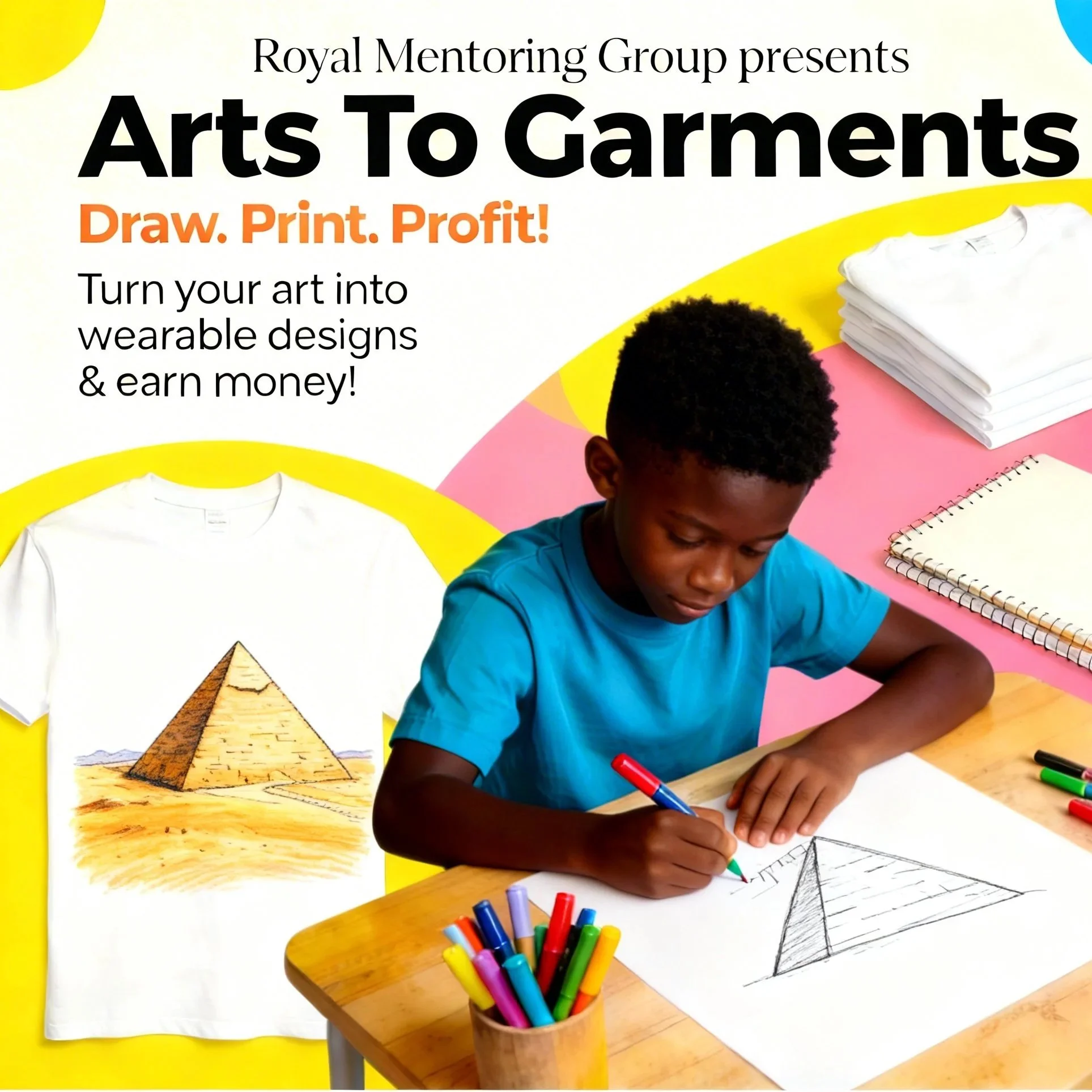 Arts To Garments is a creative entrepreneurship program that empowers youth to turn their artwork into wearable designs. Students create original drawings that are digitally transferred and printed onto t-shirts and hoodies, which are then sold for profit. Through this process, youth gain hands-on experience in art, technology, and business while generating income for themselves and their school. The program builds confidence, encourages self-expression, and introduces real-world skills in branding, production, and financial literacy.